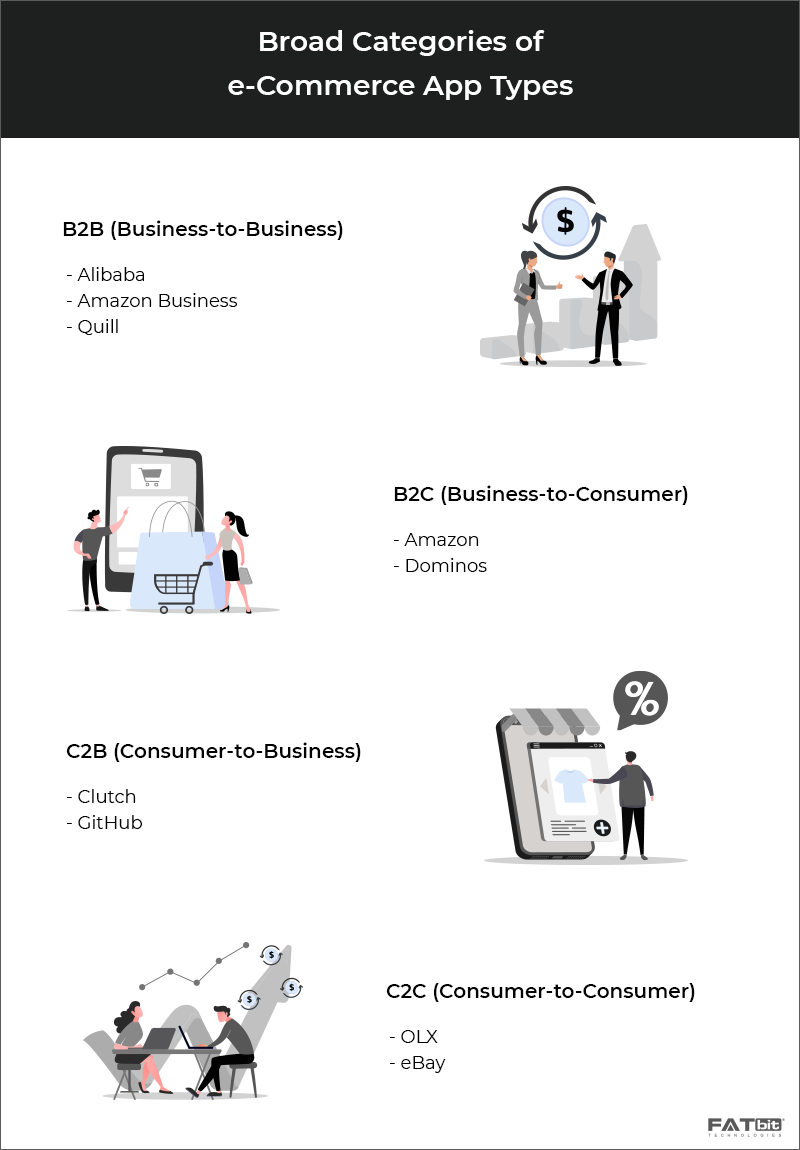 Different types of ecommerce apps, developed to facilitate different activities that will be happening over them, are described here: