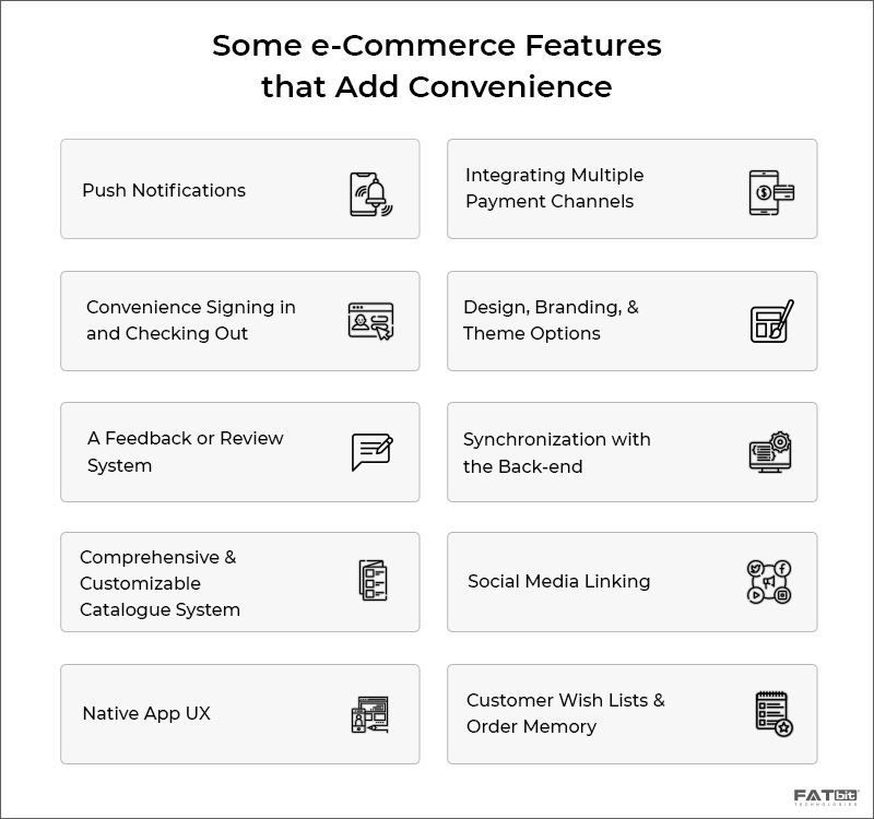 The requirements of an ecommerce app vary from business to business. A food delivery app requires a different set of features than a taxi booking app. However, there are still very few features that overlap on the interfaces of many types of ecommerce apps. For example, a search bar, chatbot, and payment gateway.