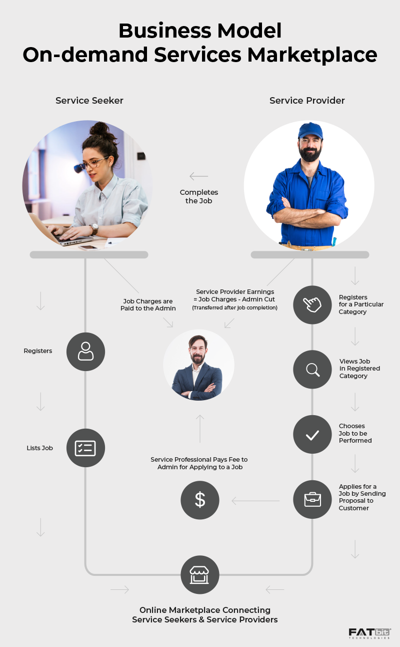 An on-demand service platform connects service seekers and providers. The flow of such a marketplace is illustrated below: