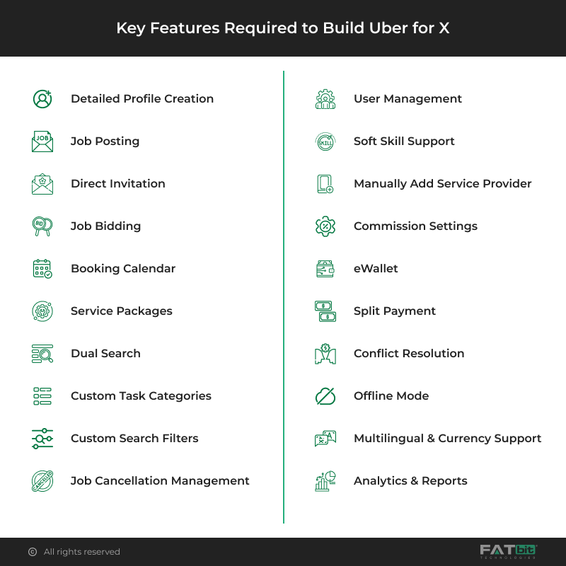 To enable smooth service marketplace operations and ensure a satisfying user experience, certain features are required. These features will help manage marketplace operations, overcome challenges, and deal with daily business use cases. Below is the list of some essential features for an Uber for X marketplace.