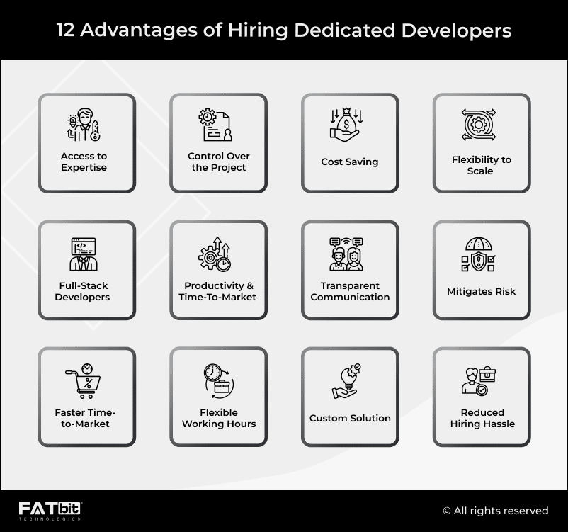 12. Reduced Hiring Hassle: Recruiting tech talent is really complex, time-consuming, and expensive. At the same time finding the right guy for the job is always a challenging process that may include conducting multiple interview rounds, managing complex onboarding, risking potential skill mismatches, and so on. However, dedicated developers help you eliminate this entire recruitment suffering by providing immediate access to pre-vetted, highly skilled professionals.