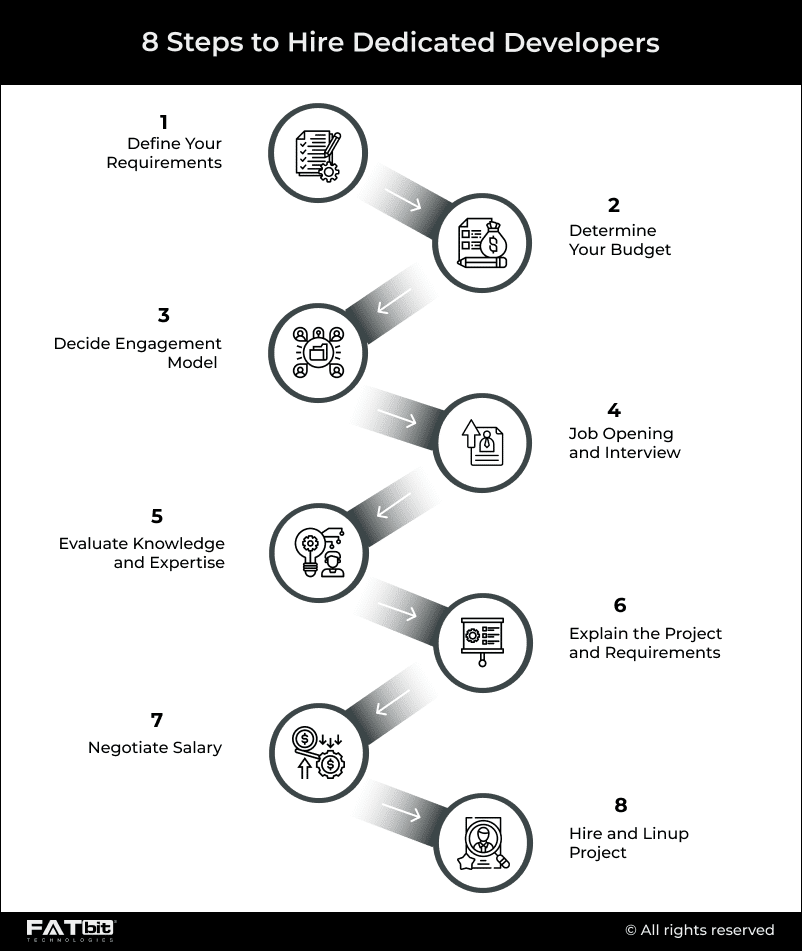 10. Flexible Working Hours: The advantage of dedicated developers lies in their adaptability and flexibility to work. These professionals are flexible to align their working hours with your specific project requirements, time zones, and operational needs. Whether you need round-the-clock development, want to synchronize with international teams, or require intense sprints during critical project phases, dedicated developers offer unparalleled scheduling flexibility. 8 Steps to Hire Dedicated Developers for Your Project
