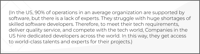 1. Access to Expertise: By hiring dedicated developers, you can get access to global talent from skilled developers with in-depth knowledge and experience in specific technologies and domains. In the US, the world’s leading tech hub and startup hotspot, there is a lack of expertise.